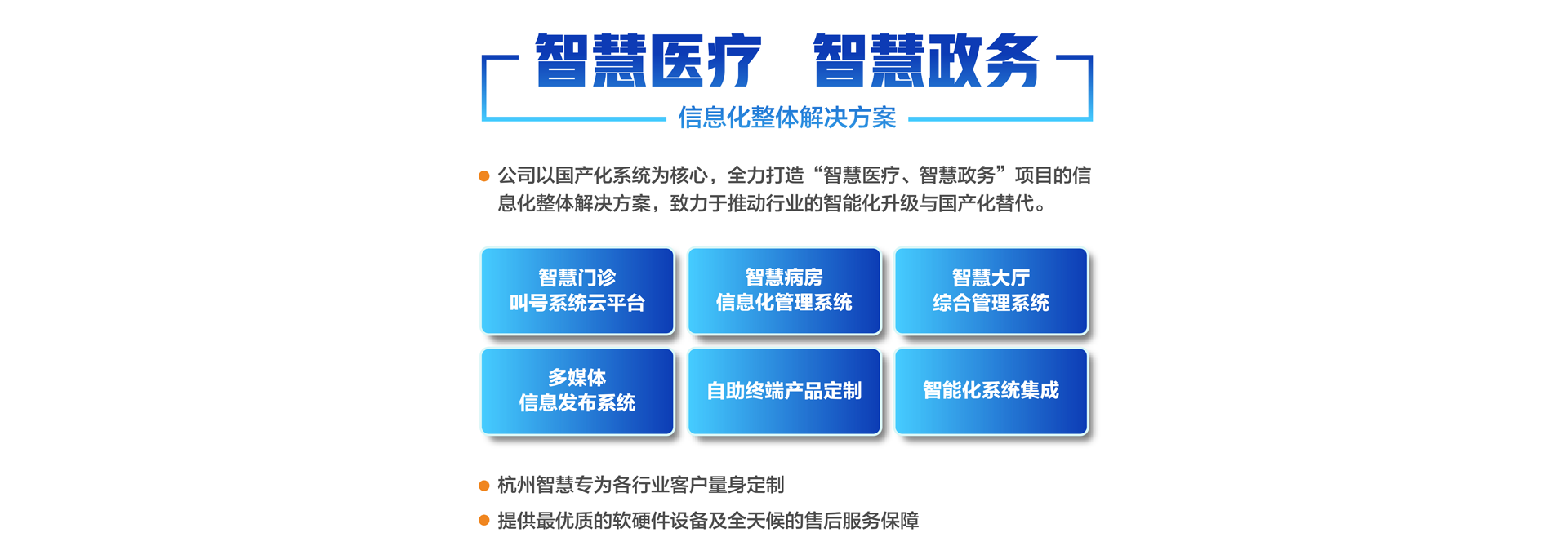 杭州智慧科技有限公司初創(chuàng)于2003年,總部位于重要的電子商務(wù)中心中國杭州公司主營業(yè)務(wù)有:智慧分診叫號系統(tǒng)、智慧病房醫(yī)護(hù)對講系統(tǒng)、智慧大廳綜合管理系統(tǒng)、智慧政務(wù)管理系統(tǒng)、智慧多媒體信息發(fā)布系統(tǒng)、導(dǎo)診系統(tǒng)及各自助終端產(chǎn)品定制。專為各行業(yè)客戶量身定制。公司已有20余年行業(yè)經(jīng)驗沉淀積累,擁有優(yōu)秀的產(chǎn)品外觀設(shè)計師和各類中高級專業(yè)技術(shù)工程師,確保所研發(fā)的產(chǎn)品具有行業(yè)領(lǐng)先的外觀及可靠的技術(shù)性能。并擁有權(quán)威部門頒發(fā)的各類知識產(chǎn)權(quán)及專利證書,30多項資質(zhì)證書、800多個合作伙伴、2000多個項目成功案例經(jīng)驗。 智慧產(chǎn)品已遍及全國各醫(yī)療、政務(wù)、金融、通訊、公安、工商、稅務(wù)等行業(yè),形成以“立足杭州、輻射長三角、拓展全國”的戰(zhàn)略發(fā)展格局,產(chǎn)品經(jīng)過歷年不斷創(chuàng)新,形成專業(yè)化、平臺化,致力于成為智慧產(chǎn)品的領(lǐng)軍企業(yè)。 公司建立了完善的技術(shù)培訓(xùn)及售后服務(wù)中心,并設(shè)24小時熱線咨詢電話解答用戶反饋的問題。同時應(yīng)客戶要求定期派技術(shù)人員到 全國各地進(jìn)行技術(shù)指導(dǎo)輔助用戶正確使用智慧產(chǎn)品并能獨(dú)立安裝、調(diào)試、日常維護(hù)等工作。提供最優(yōu)質(zhì)的設(shè)備及全天候的售后服務(wù)保障,智慧永恒不變的服務(wù)宗旨——致力于客戶的滿意與成功!...